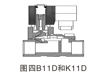 該閥代號D系列,依據先導泄壓膜片封腔設計,閥分為常閉型和常開(kāi)型兩種。原理:常閉型(常態(tài),呈關(guān)閉狀態(tài)),當線(xiàn)圈通電時(shí),產(chǎn)生電磁力使動(dòng)鐵芯和靜鐵芯吸合,隨著(zhù)動(dòng)鐵芯上移,先導腔開(kāi)啟泄壓帶動(dòng)主閥膜片.上腔泄壓,使膜片向上運動(dòng)從而開(kāi)啟主閥,介質(zhì)通過(guò)。當線(xiàn)圈斷電時(shí),電磁力消失,此時(shí)動(dòng)鐵芯在復位彈簧和介質(zhì)壓力的同時(shí)作用下,關(guān)閉小導閥,此時(shí)介質(zhì)從平衡孔流入,主閥膜片上腔壓力增大,并在彈簧力的作用下,關(guān)閉主閥口。常開(kāi)式原理正好相反。如圖四: B11D和K11D系列電磁閥。