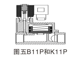 該閥代號P系列,依據先導泄壓活塞封腔設計,電磁閥由先導閥和主閥芯,聯(lián)系形成通道組合而成;原理:常閉型(常態(tài)呈關(guān)閉狀態(tài))。當線(xiàn)圈通電時(shí),產(chǎn)生的磁力使動(dòng)鐵芯和靜鐵芯吸合,導閥口打開(kāi),介質(zhì)流向出口,此時(shí)主閥活塞上腔壓力減少,低于進(jìn)口側的壓力;形成壓差克服彈簧阻力而隨之向上運動(dòng),達到開(kāi)啟主閥口的目的,介質(zhì)通過(guò)。當線(xiàn)圈斷電時(shí),磁力消失,動(dòng)鐵芯在彈簧力的作用下復位關(guān)閉先導口;此時(shí)介質(zhì)從平衡孔流入,主閥活塞上腔壓力增大,并在彈簧力的作用下向下運動(dòng),關(guān)閉主閥口。常開(kāi)式原理正好相反。如圖五:B11P和K11P系列電磁閥。