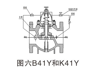 該閥代號Y系列,依據先導多路旁通泄壓設計,原理:由主閥和多個(gè)旁通外導閥連接組成。如常閉型(常態(tài)呈關(guān)閉狀態(tài))。當線(xiàn)圈通電時(shí),外閥先導旁通泄壓把主閥上腔壓力迅速變小,使主閥閥芯向.上移動(dòng),開(kāi)啟主閥,介質(zhì)通過(guò)。當線(xiàn)圈斷電時(shí),電磁力消失,此時(shí)介質(zhì)從平衡孔流入,主閥上腔壓力增大,并在彈簧力加介質(zhì)壓力的作用下關(guān)閉主閥口。常開(kāi)閥原理結構主閥上腔正好相反。如圖六: B41Y和K41Y的電磁閥
