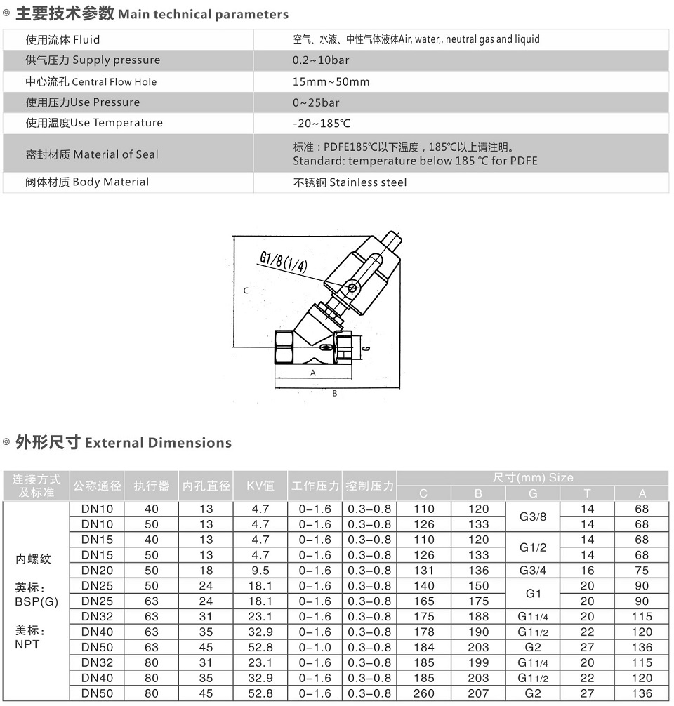 本閥為常閉型二位二通活塞角座閥,通入氣源后,在氣壓的作用下推動(dòng)活塞帶動(dòng)閥芯向上運動(dòng),將主閥開(kāi)啟,關(guān)閉氣源后在復位彈簧的作用下將主閥關(guān)閉